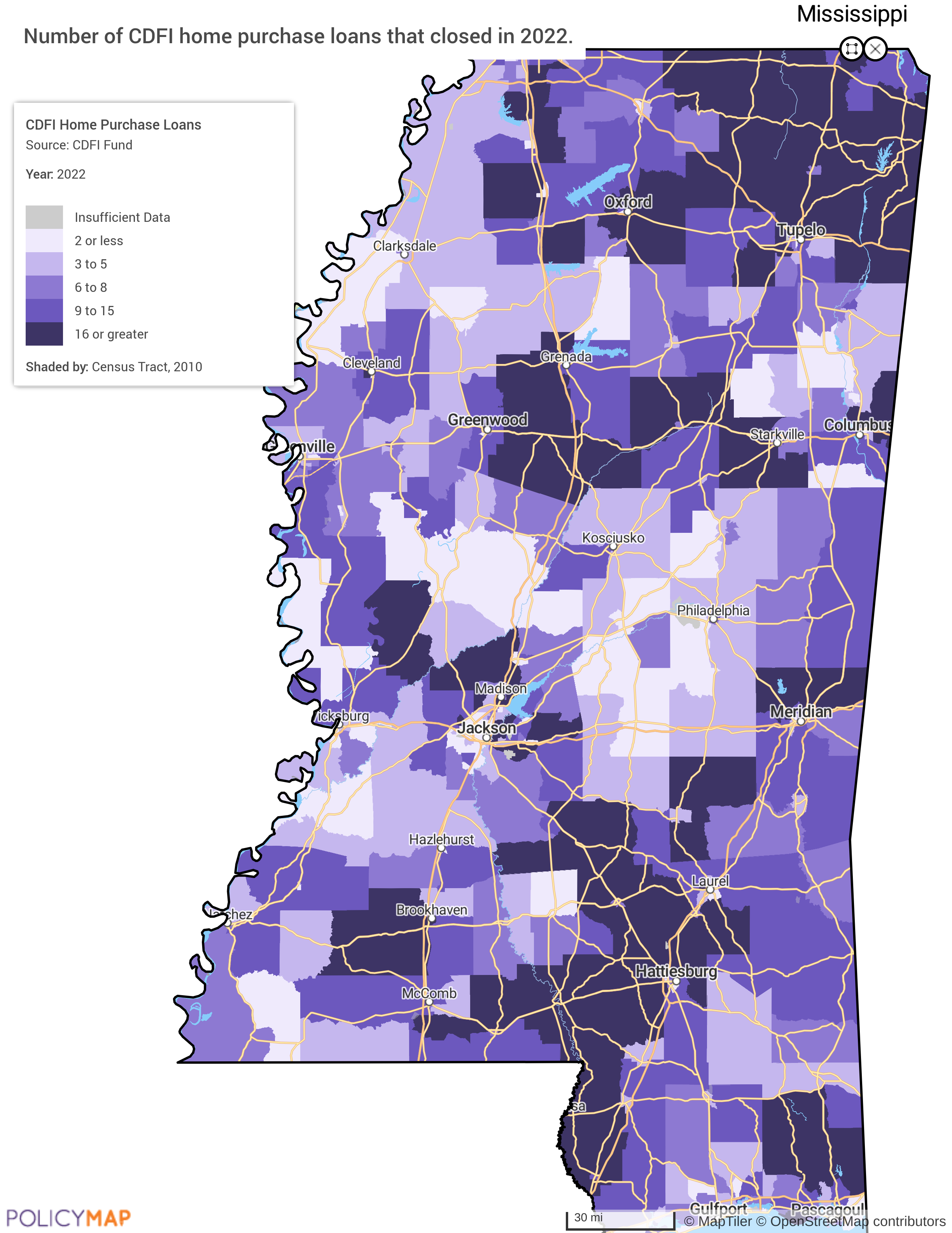 CDFI-involved loans in Mississippi, however, were more evenly distributed across the state. This suggests that CDFIs played a vital role in expanding homeownership beyond urban centers, reaching households in more rural or underserved areas. These areas of concentration are shaded in dark purple on the following map.