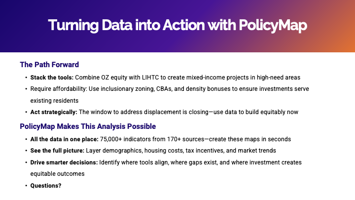Jacinda also highlighted the role of two major federal tools shaping development outcomes today: Low-Income Housing Tax Credits (LIHTC), which are central to affordable housing production, and Opportunity Zones, which are designed to attract private capital to targeted areas. By examining these programs side by side, her analysis revealed a critical gap between where investment dollars tend to flow and where affordability needs are most acute—underscoring the importance of using data to better align capital with community needs.
