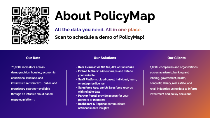Interested in how PolicyMap can help you uncover insights for smarter, more equitable development? Contact us today to learn more and schedule a personalized demo.