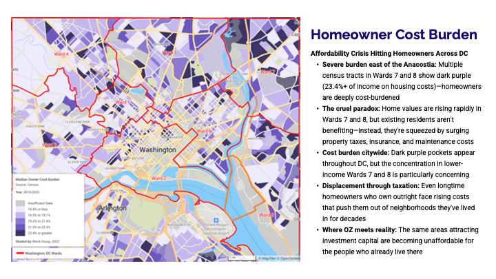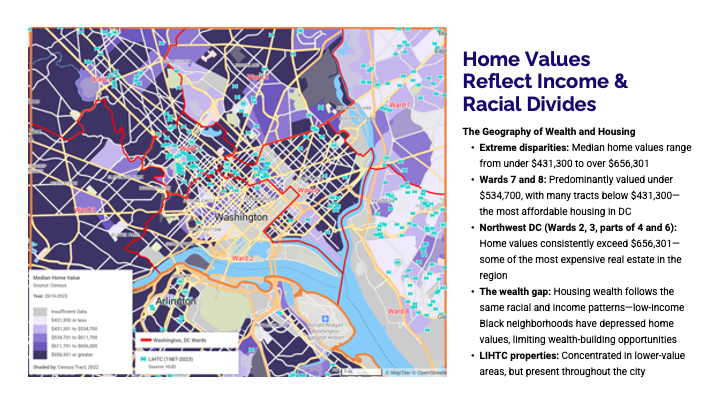 During her presentation, Data-Driven Development in D.C., Jacinda explored how data can both illuminate opportunity and surface hard truths about equity in the region. Using PolicyMap data, she unpacked the complex relationships between income, race, housing costs, and geography—showing how who lives where is deeply connected to decades of policy and investment choices.