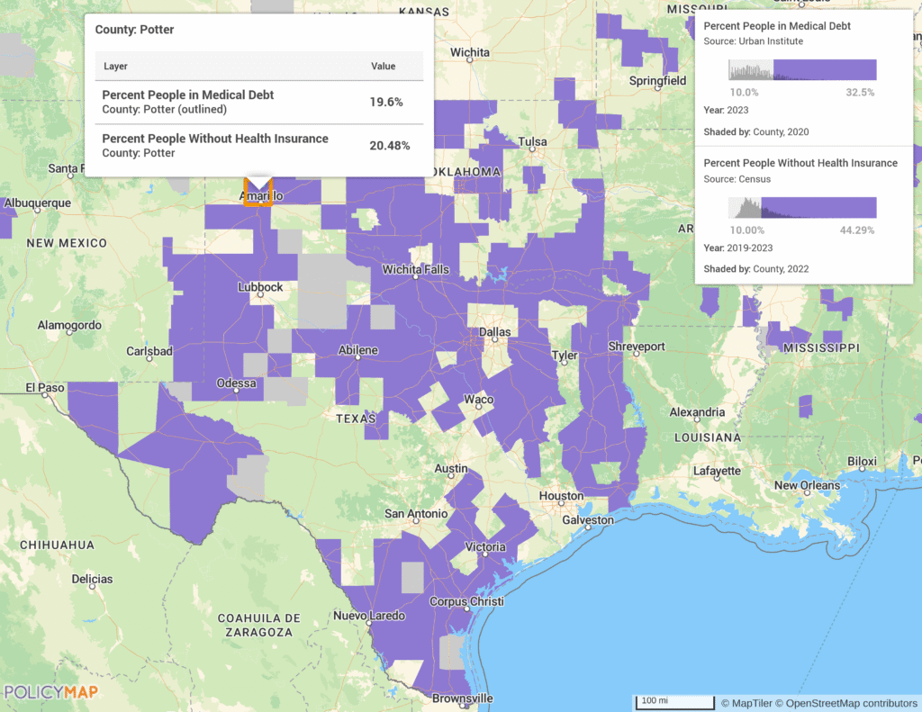 Want to see how PolicyMap can help your organization visualize and address the local impacts of medical debt? Connect with our team to learn more about how our data and mapping tools strengthen your policy analysis and advocacy around medical debt and access to care.