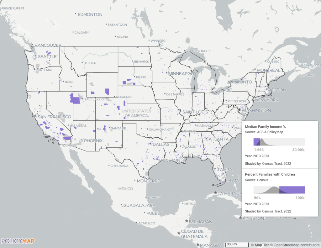 Running spatial queries on a web-based mapping application is hard work! If you tried to create a Multi-Layer Map last year showing intersections across several Census Tract layers for the whole US, you would have been prompted to zoom in closer to see results. Not anymore! Now you can layer more granular data at further out zoom levels. For example, users can now create a map for the entire US showing tracts that are considered low-moderate income AND where the majority of families have children living at home.