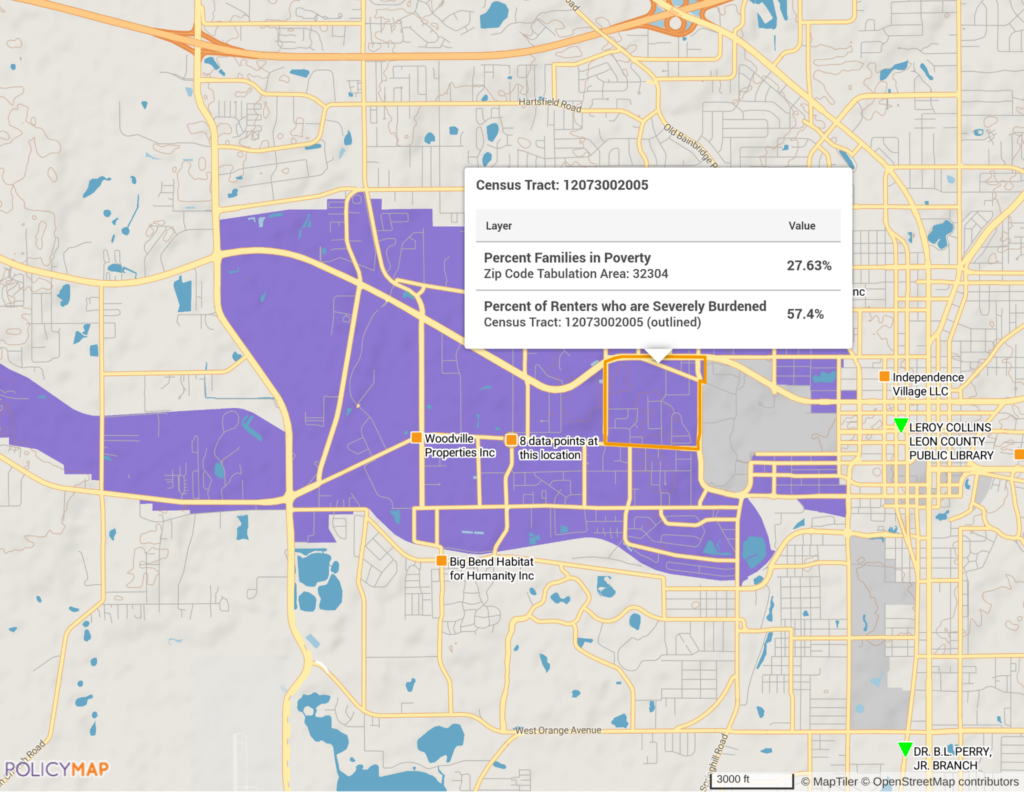 In the area west of Tallahassee’s Leroy Collins Leon County Public Library, for example, mapping families in poverty who are severely rent-burdened alongside housing nonprofits highlights how library access intersects with economic vulnerability and community support networks.