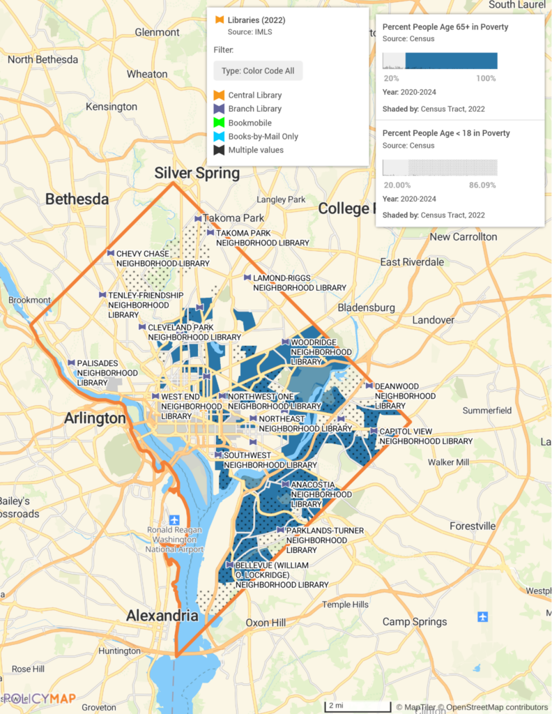 - Place-based mapping reveals how libraries intersect with community challenges, such as housing instability, health risks, and digital inequality.