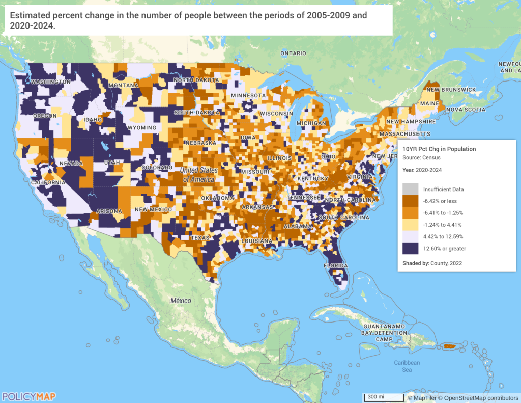 The latest ACS data makes it possible to see how the population has shifted across the country over the past two decades. The 10-year percent change in population reveals a clear pattern: strong growth concentrated in the Sun Belt, with Florida, Texas, Arizona, Nevada, Utah, and the Carolinas and Tennessee leading the way, alongside continued gains across the Mountain West and Pacific Northwest, including Idaho, Colorado, Oregon, and Washington. Meanwhile, parts of the Midwest and Northeast continue to see decline, reflecting longer-term trends in migration and population growth.