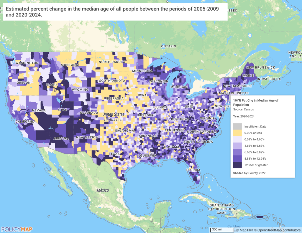 The U.S. population is aging steadily, and the 10-year percent change in median age makes that shift visible at the local level. Recent data reveal a population that is older, longer-living, and gradually more balanced between men and women at later ages. Some communities have aged significantly faster than others over the past two decades, shaped by declining fertility and the aging of the baby boomer generation.