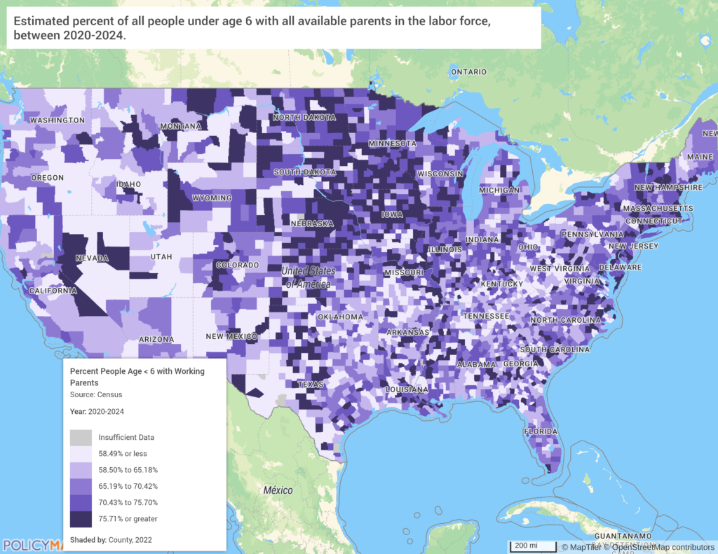 Against a backdrop of persistent poverty, newly available indicators help illustrate how families with young children are navigating the combined demands of work and caregiving. In households with children under age six where all available parents are in the labor force, caregiving and paid work are tightly overlapping, occurring within the same constraints of time, income, and support systems. The data reveal where that intersection of early childhood and full workforce participation is most pronounced.