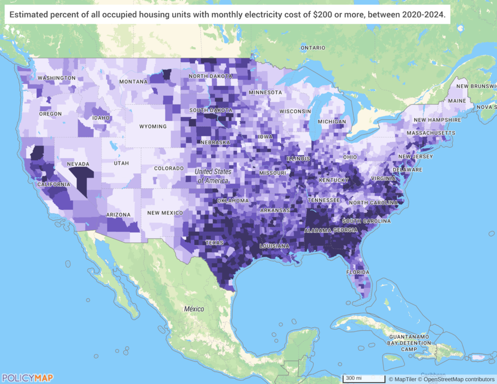 Utility costs often have less flexibility in household budgets. New indicators track the share of households spending $100 or more, and $200 or more, per month on electricity, providing a clearer picture of where higher utility burdens are most concentrated. The darkest purple illustrates where 50% or more households are paying $200 or more for electricity.