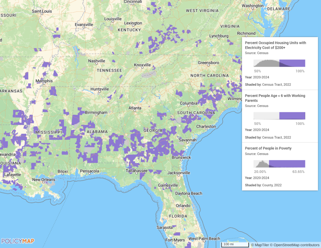 Utility costs are particularly relevant here because, unlike rent or discretionary spending, they do not adjust with income or employment status. When mapped together, counties where poverty rates exceed 20%, more than half of households pay $200 or more per month for electricity, and more than half of children under six have all parents in the labor force, reveal a striking concentration of compounding pressure, particularly across the Southeast. It is only when the data is layered together that the full weight of these overlapping burdens becomes visible.