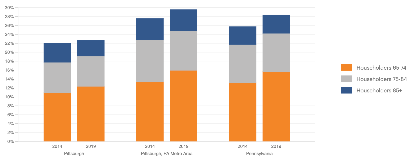 In the charts below, Pittsburgh, PA’s share of households headed by a senior has increased from 2014 to 2019.