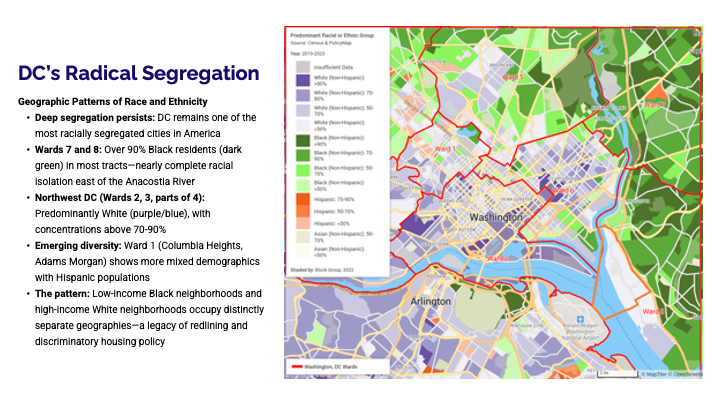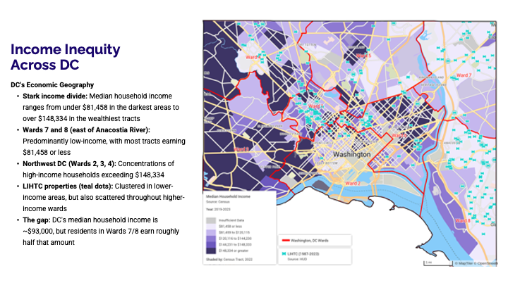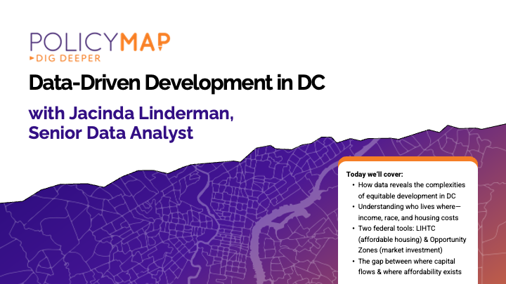 During her presentation, Data-Driven Development in D.C., Jacinda explored how data can both illuminate opportunity and surface hard truths about equity in the region. Using PolicyMap data, she unpacked the complex relationships between income, race, housing costs, and geography—showing how who lives where is deeply connected to decades of policy and investment choices.