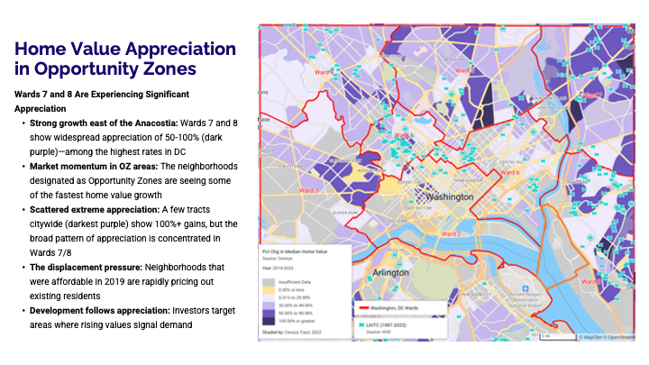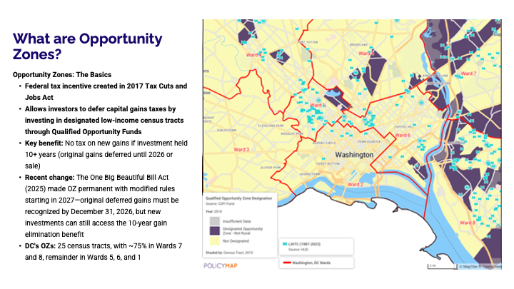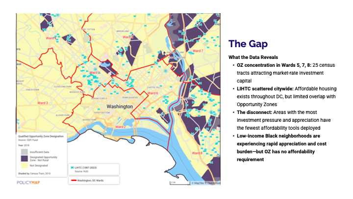 Jacinda also highlighted the role of two major federal tools shaping development outcomes today: Low-Income Housing Tax Credits (LIHTC), which are central to affordable housing production, and Opportunity Zones, which are designed to attract private capital to targeted areas. By examining these programs side by side, her analysis revealed a critical gap between where investment dollars tend to flow and where affordability needs are most acute—underscoring the importance of using data to better align capital with community needs.