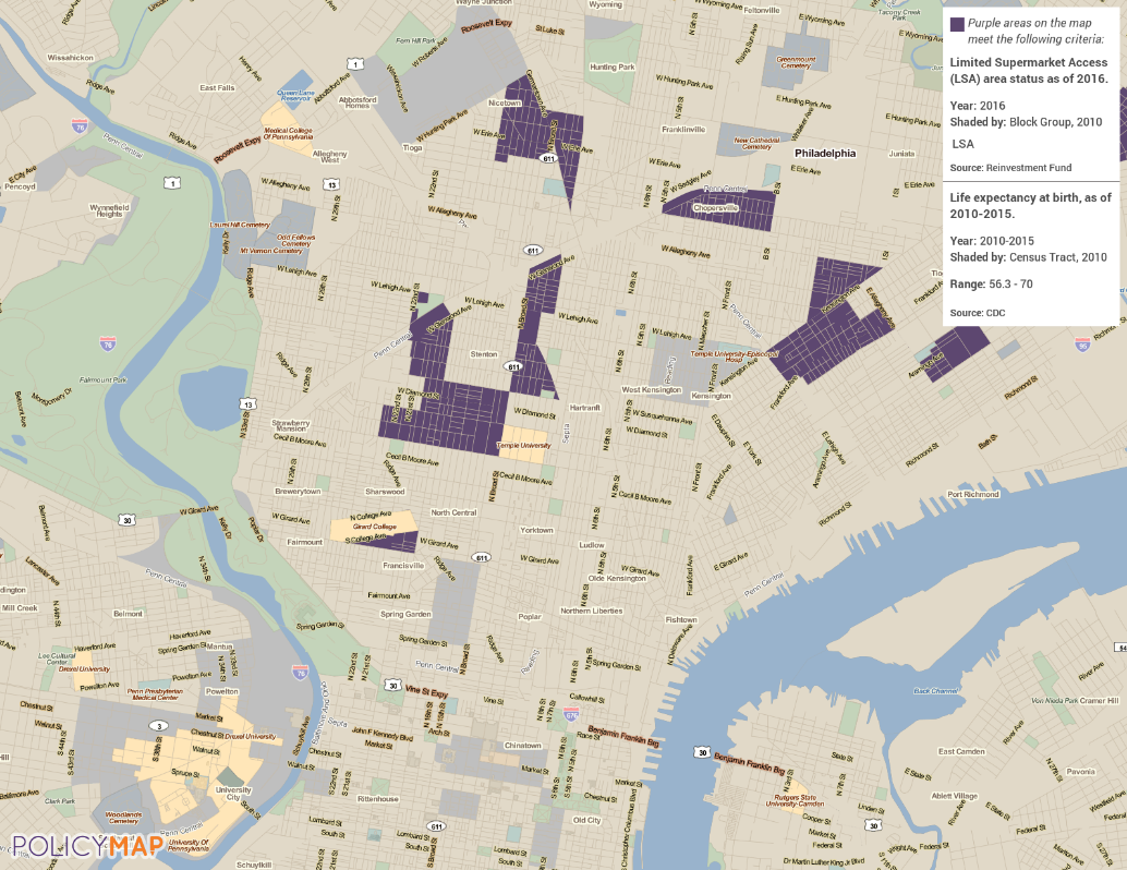 The map below highlights some of the neighborhoods of Philadelphia with lower life expectancies that also have less access to supermarkets. People living in these areas might benefit from greater access to healthy foods. Meeting with community members and local organizations working in food access can help determine which of the suite of possible actions would be feasible, helpful, and wanted.