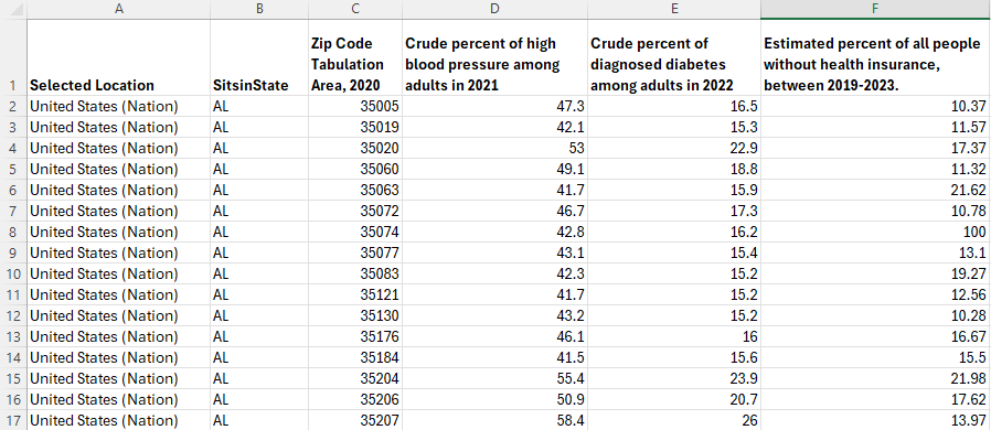 While the map visualization clearly reveals patterns, such as concentrations of qualifying ZIP codes across parts of the southern U.S., users may want to perform additional, ad-hoc analysis of the underlying data. With Multi-Layer Downloads, users can easily export the filtered layers to a CSV file for further analysis in Excel or another database system. The table below shows a sample of the downloaded data from this Multi-Layer Map, opened in Excel.