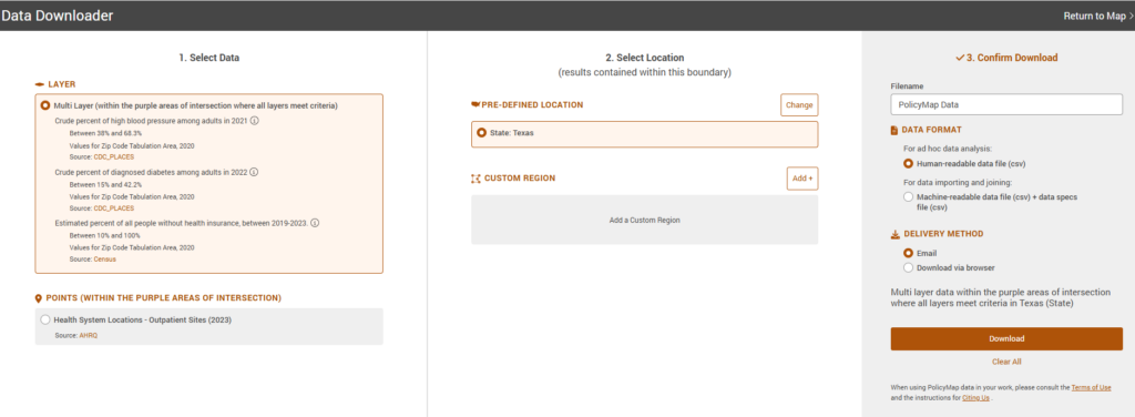 Downloads can be generated for both AND Multi-Layer Maps, which highlight areas that meet all conditions across all data layers, and OR Multi-Layer Maps, which show areas that meet the criteria for one or more layers. AND Multi-Layer downloads capture only the areas of intersection (the purple regions on the map) that satisfy every condition. In these downloads, all indicators are combined into a single CSV file. OR Multi-Layer downloads, by contrast, are delivered as separate CSV files for each layer included in the map, with each file containing only the geographies that meet that layer’s filtering criteria.