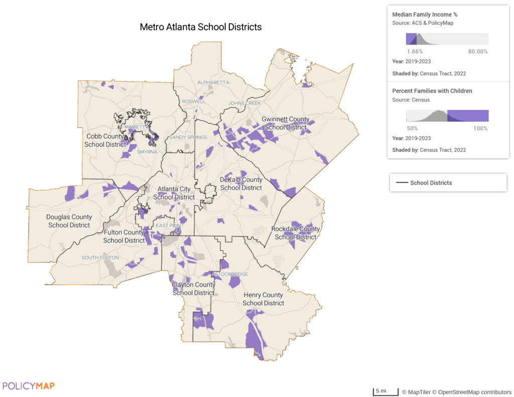 The map below shows the same layers from the previous example (low- to moderate-income areas with a high concentration of families with children) clipped to a Custom Region created from several Metro Atlanta school districts.