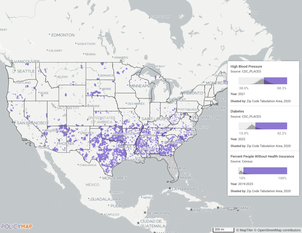 For example, a user performs a nationwide analysis of the convergence of chronic health conditions (high blood pressure and diabetes) and populations without health insurance. The map below shows ZIP code areas with above average prevalence of both chronic conditions AND relatively high rates of uninsured population.